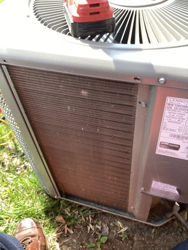 Performed routine maintenance on outdoor condensing unit as part of recurring cooling service. Condenser coils showed significant accumulation of dirt, debris, and organic matter between fins. Cleaned condenser coils using appropriate tools and techniques to restore proper airflow and heat transfer efficiency. Removed leaves, twigs, and other debris from coil surfaces and surrounding unit base. Unit operational upon completion of maintenance.