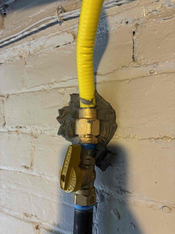 Responded to gas service disconnection by utility company due to leak at connection points serving dryer and water heater. Repaired defective gas line connections at both appliances, installed new brass fittings and flexible corrugated gas connector with shutoff valve, and performed pressure test to verify system integrity before utility restoration.