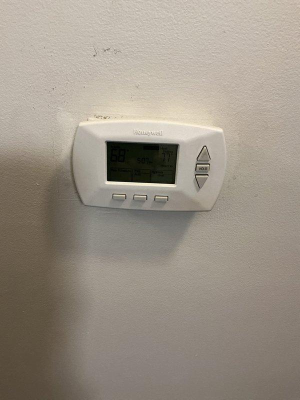 Responded to service call for thermostat malfunction and inconsistent heating. Upon arrival, inspected Emerson digital thermostat and removed cover to examine internal components. Found battery-powered unit with AAA batteries installed, circuit board, and wiring connections intact at terminal blocks. Verified thermostat display functionality showing temperature readings. Documented existing equipment condition with photographs of exterior unit and internal components including PCB, LCD display, battery compartment, and wire terminal connections for service records.