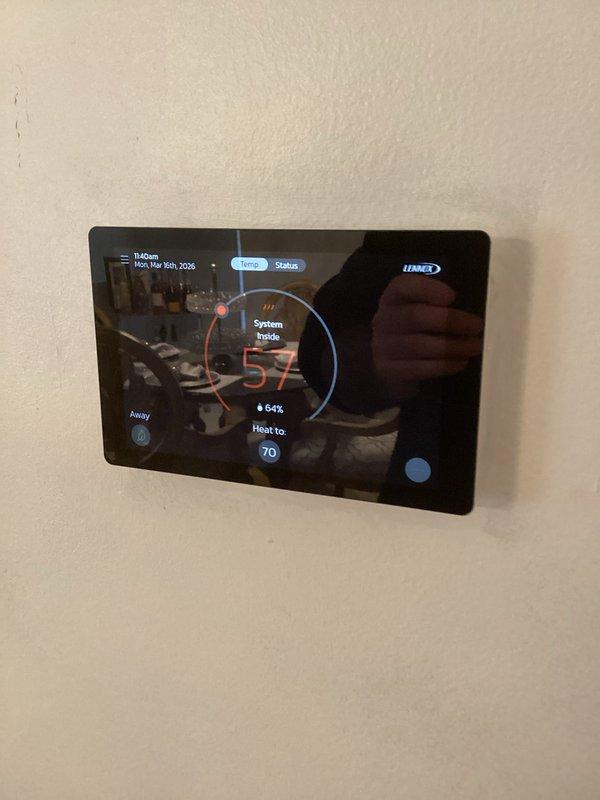Responded to callback for communication error on a Lennox smart thermostat installed in June 2023. Diagnosed and restored system functionality, confirming proper operation with heat mode functioning at 64% capacity and maintaining the set temperature of 70°F. Service performed under existing parts warranty.