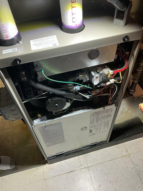Completed annual furnace tune-up and maintenance on residential HVAC system during evening appointment window. Performed comprehensive inspection of blower motor assembly, electrical connections, and control boards; verified proper operation of all mechanical components including dual blower fans and condensate drainage system. All colored wire connections, relay modules, and circuit boards inspected and confirmed secure with no issues found; unit operating within normal parameters and ready for upcoming heating season.