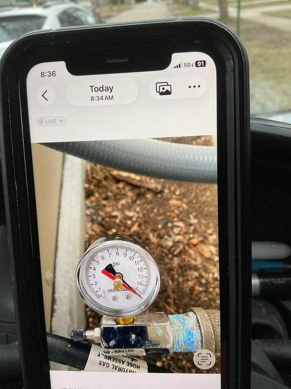 Arrived on site and performed gas pressure test on generator system. Verified pressure reading within acceptable range (0-5 psi) on calibrated gauge. Documented test results with photographic evidence of pressure readings on connected gas line.