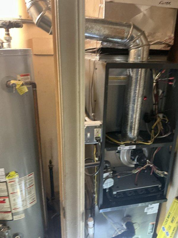 Conducted evaluation of 1998 natural gas furnace system located in basement. Unit is currently operational but approaching end of useful life at 25+ years. Inspection revealed aging ductwork with multiple connection points and a Honeywell humidifier component integrated into the system. Replacement options were presented to upgrade efficiency and reliability while utilizing existing utility connections.