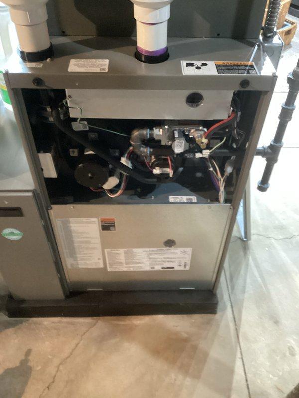 Completed annual furnace maintenance on residential HVAC system. Performed comprehensive tune-up including inspection of internal components, blower motor assembly, electrical connections, and exhaust/intake PVC piping. Unit is functioning properly with no visible issues or malfunctions detected.