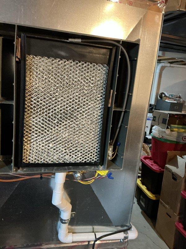 Completed scheduled ComfortGuard maintenance visit on residential HVAC system, replacing air filters and humidifier pad as requested. Accessed evaporator coil unit/air handler, installed new honeycomb-patterned humidifier pad in the rectangular metal frame assembly, and replaced system air filters. Verified proper operation of condensate drain line and electrical connections, ensuring all components were secure before closing access panel.