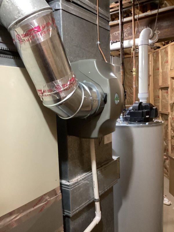 Installed a 17-gallon whole-home humidifier on the HVAC duct system and reconfigured the water supply line from the existing cold water connection to hot water per customer request. The humidifier was mounted to the supply plenum with proper drainage established, and all connections were tested for leaks and proper operation.