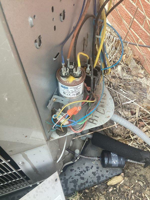 Responded to no-cool condition on 11-year-old Bryant central air conditioning system. Upon arrival, confirmed outdoor condensing unit was not operating and exhibiting buzzing/surging sounds when attempting to start. Diagnosed failed dual run capacitor causing compressor and condenser fan motor startup failure. Replaced defective capacitor with new JARD capacitor, verified proper microfarad ratings and voltage specifications. Tested system operation, confirmed compressor and outdoor fan motor starting properly with no abnormal sounds. System restored to normal cooling operation.