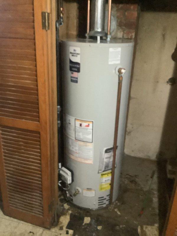 Completed installation of residential tanked water heater in basement utility area. Removed existing unit and installed new white cylindrical water heater against concrete wall, connecting copper supply lines and metallic exhaust vent pipe. Verified all connections for proper operation, ensured compliance with manufacturer specifications, and confirmed unit functionality upon completion.