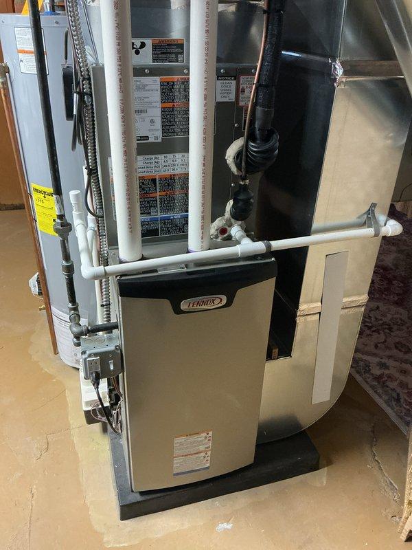 Completed annual maintenance on Lennox furnace system. Performed comprehensive tune-up including inspection of all major components, heat exchanger, burner assembly, and ignition system. Verified proper operation of blower motor, checked and cleaned flame sensor, and tested safety controls. Inspected PVC venting system and condensate drain lines for proper drainage and secure connections. Examined ductwork and plenum connections for air leaks. Confirmed gas pressure and combustion efficiency within manufacturer specifications. Tested thermostat operation and system cycling. All components functioning properly with no deficiencies noted. System operating safely and efficiently. Documented service with photos for maintenance records.