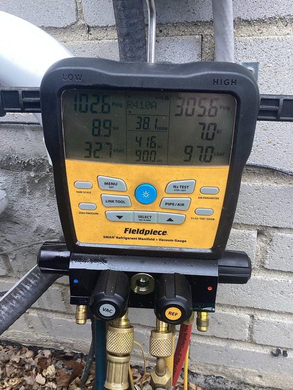 Completed annual cooling maintenance on residential HVAC system. Performed comprehensive system inspection including temperature differential measurements across evaporator coil (44.6°F recorded), verified refrigerant pressures and superheat/subcooling readings using digital manifold gauges (suction pressure 36.8 PSI, discharge pressure 252.0 PSI), confirmed proper system operation and airflow through condensing unit. All components operating within manufacturer specifications with no deficiencies noted.