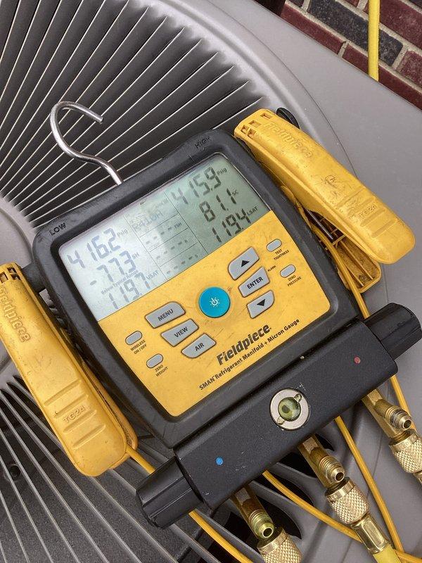 Responded to warranty service call for 9-year-old air conditioning system reported as non-operational. Upon arrival, performed comprehensive diagnostic evaluation of the refrigerant system using calibrated manifold gauges and digital monitoring equipment. Measured system pressures and temperatures on both low and high side circuits to identify operational deficiencies. Analysis revealed abnormal pressure readings requiring refrigerant system intervention. Connected service manifold to system access ports and conducted thorough assessment of refrigerant charge levels and system performance parameters. Documented all pressure and temperature readings for warranty claim verification. Performed necessary repairs to restore system to proper operating condition under manufacturer warranty coverage. System tested and verified operational upon completion of service work.