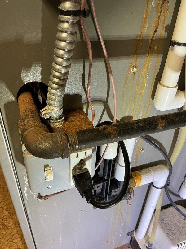 Responded to no-heat call for 15-year-old furnace. Diagnosed multiple issues including GFCI reset button malfunction and thermostat communication failure with smart hub. Observed significant rust and water damage on utility area components, particularly affecting iron pipes and surrounding wall surfaces. Completed necessary repairs to restore heating functionality.