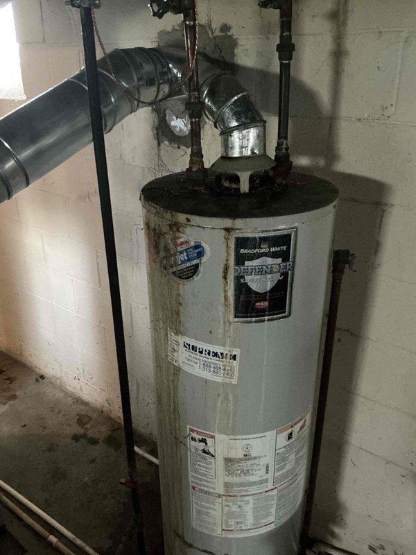 Provided comprehensive replacement estimate for 15+ year old residential HVAC system including natural gas furnace, air conditioning unit, and water heater located in basement. Assessed existing Bradford White water heater showing significant deterioration with extensive rust staining, corrosion, and aging on exterior tank surface. Documented current equipment conditions and specifications for complete system replacement under BOGO promotion.