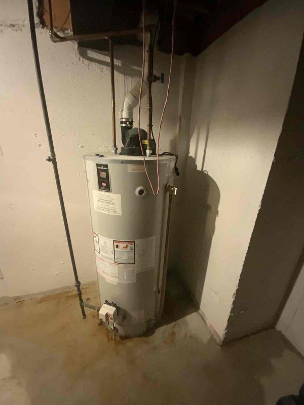 Conducted on-site assessment of existing residential water heater installation in basement utility area. Evaluated current unit specifications, plumbing connections including copper supply lines and shut-off valves, electrical conduit routing, and overall system condition. Documented equipment with photographs and provided comprehensive estimate for water heater replacement options.