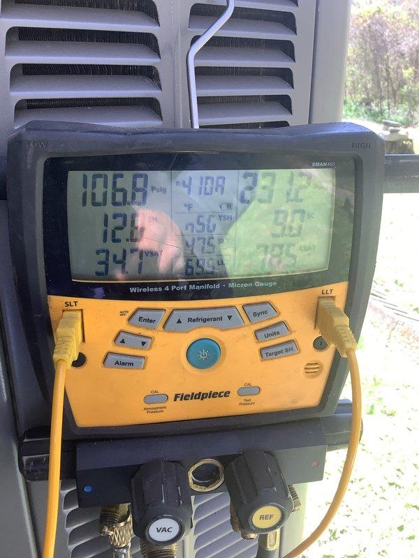 Replaced defective condenser fan motor and blade on outdoor HVAC unit. System diagnostics were performed using digital manifold gauges to verify proper refrigerant pressures and operating parameters following the repair.