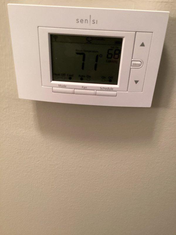 Responded to no cooling call on newly installed air conditioning system under warranty. Upon arrival, found Sensi programmable thermostat displaying 77°F with system not achieving desired temperature setpoint. Performed diagnostic evaluation of thermostat operation and system communication, documented thermostat display and settings with photos for warranty reference.