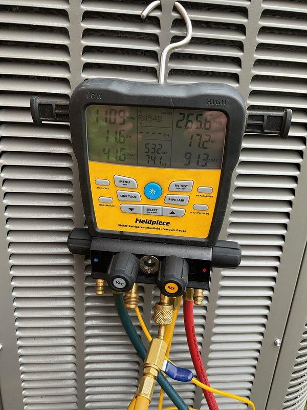 Responded to no cooling complaint on a few-months-old A/C unit located in basement. Upon arrival, system was completely non-operational. Performed diagnostic testing using digital manifold gauges to measure refrigerant pressures and temperatures across the system. Verified proper refrigerant charge levels, superheat, and subcooling values. Inspected electrical connections, control board, thermostat communication, and safety switches. Identified and resolved issue preventing unit startup. System tested successfully after repairs, confirmed proper operation with all temperatures and pressures within manufacturer specifications. Unit cooling effectively with both parts and labor covered under warranty.